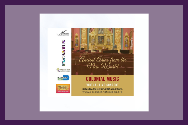 With the support of the Miami-Dade County Department of Cultural Affairs and the Cultural Affairs Council, the Miami-Dade County Mayor and Board of County Commissioners, Miami Saloon Group Inc, Corpus Christi Catholic Church, Colonial Florida Cultural Heritage Center, and Grove Wealth Management, Encantus Music presents this unique concert "Ancient Arias from the New World".