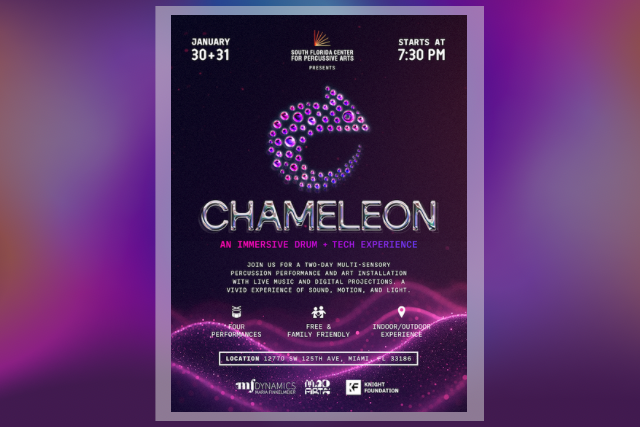 South Florida Center for Percussive Arts (SFCPA) will come alive January 30 and 31 with Chameleon, a two-day, multi-sensory performance and art installation merging live music with cutting-edge technology. Created by MF Dynamics with support from MAD Arts and funding by the Knight Foundation, the project reimagines how audiences experience sound and musical movement, turning the entire SFCPA into a playground of rhythm, color, and emotion.